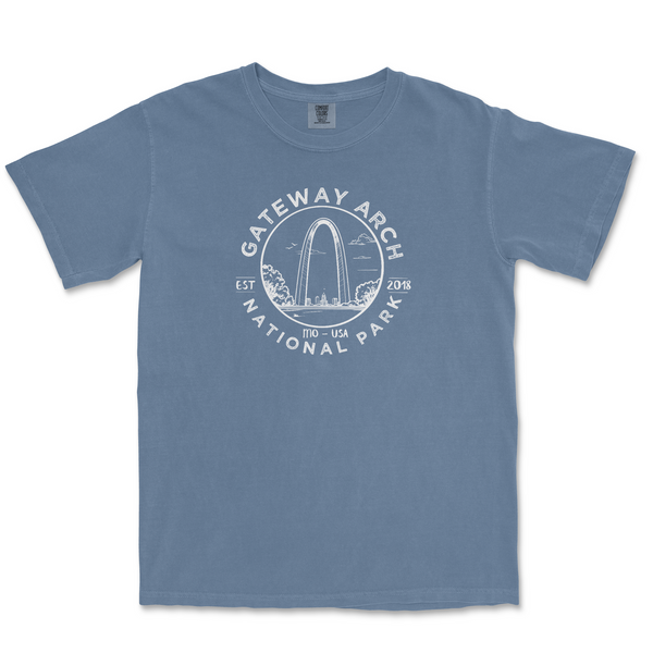 Gateway Arch National Park Comfort Colors T Shirt. It is printed with white environmentally friendly water based ink on a Comfort Color garment dyed T-shirt. These shirts are relaxed fit and heavy weight.